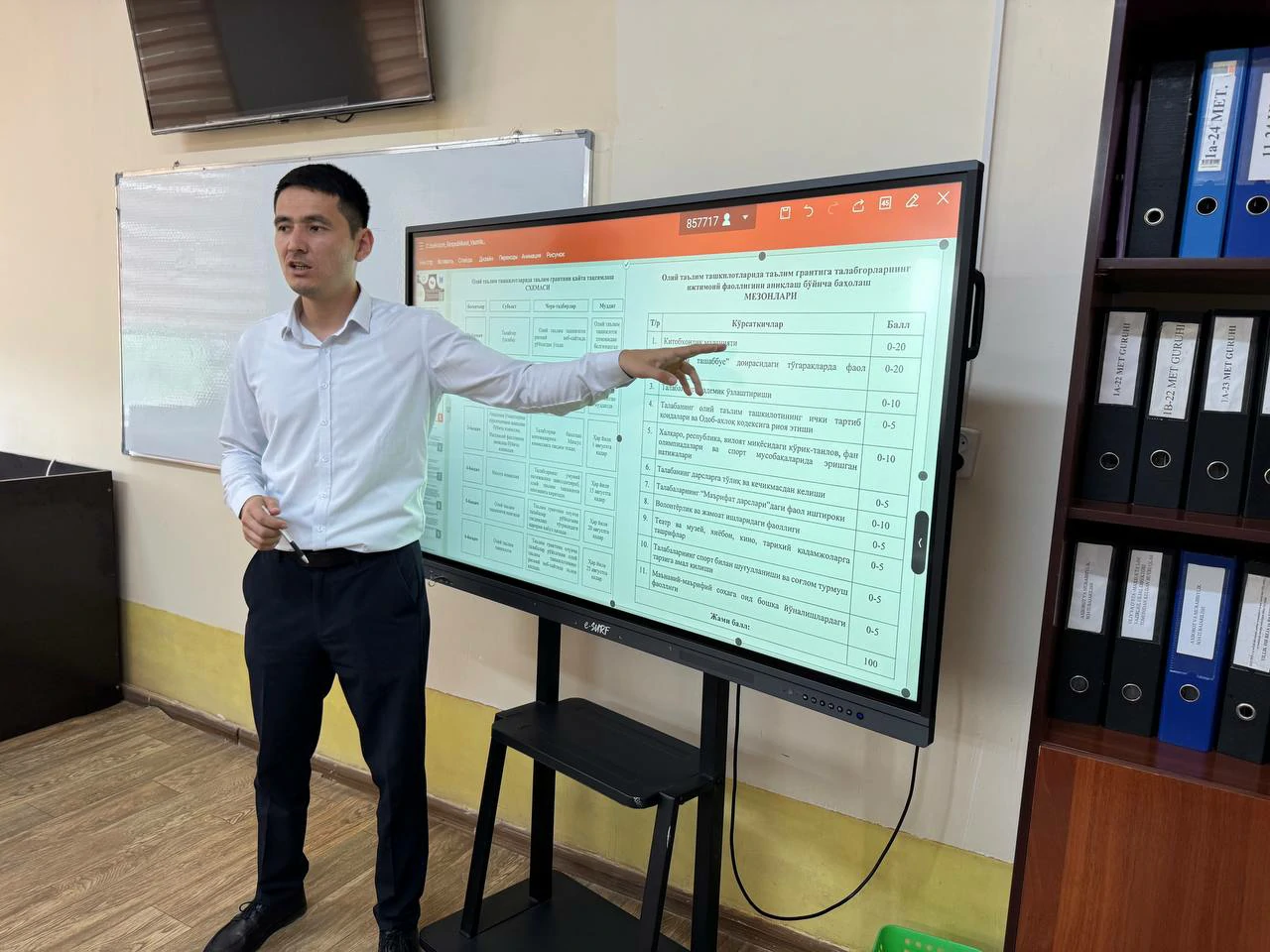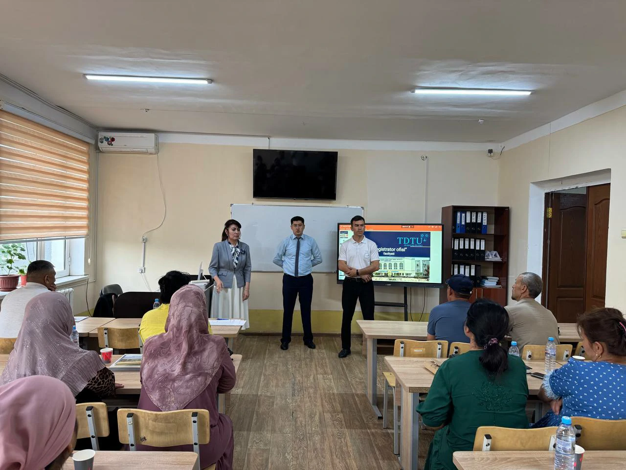 Shundan soʻng mutasaddilar tomonidan bu oʻquv yilidan oliy ta’lim sohasida faoliyat boshlagan 60 turdan ortiq xizmat turlarini koʻrsatuvchi Registrator ofis hamda Ma’lumotlar bazasi boʻlimi faoliyati haqida ota-onalarga tushuntirildi. “Kompleans nazorat” tizimini boshqarish boʻlimi tomonidan ota-onalar fikrini oʻrganish maqsadida savolnoma oʻtkazildi.