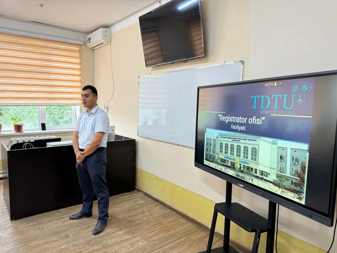 Kuni kecha TDTU Olmaliq filiali Metallurgiya va kimyoviy texnologiyalar fakulteti rahbariyati va 1-bosqich talabalarining ota-onalari bilan uchrashuvi tashkil etildi. Tadbirda filial Registrator ofisi boshligʻi N.Nosirov, Ma’lumotlar bazasi boʻlimi boshligʻi R.Toʻxtayev, “Kompleans nazorat” tizimini boshqarish boʻlimi mutaxassisi S.Nuraliyeva, filial psixologi M.Yoʻlchiyeva hamda fakultet tyutori J.Norboyev ishtirok etishdi.