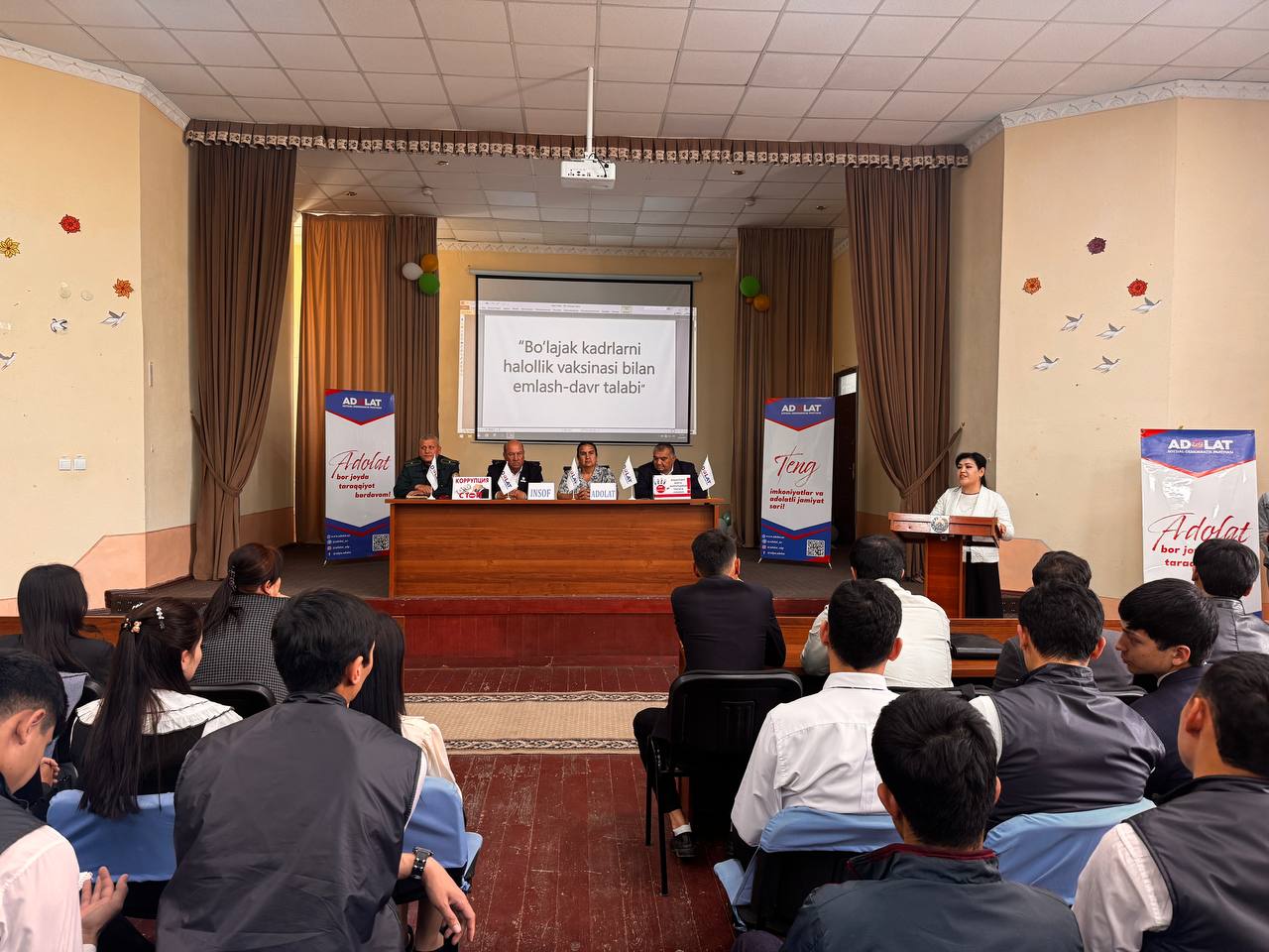 Tadbir davomida Adolat SDP Toshkent viloyati Kengashi raisi o‘rinbosari U.Fayzullayev, Adolat SDP Olmaliq shahar Kengashi raisi F.Matasimov, Adolat SDP Olmaliq shahar Kengashi deputati M.Ashurova, filial inspektori A.Xaydarovlar mavzu yuzasidan ma’ruza qilishdi.