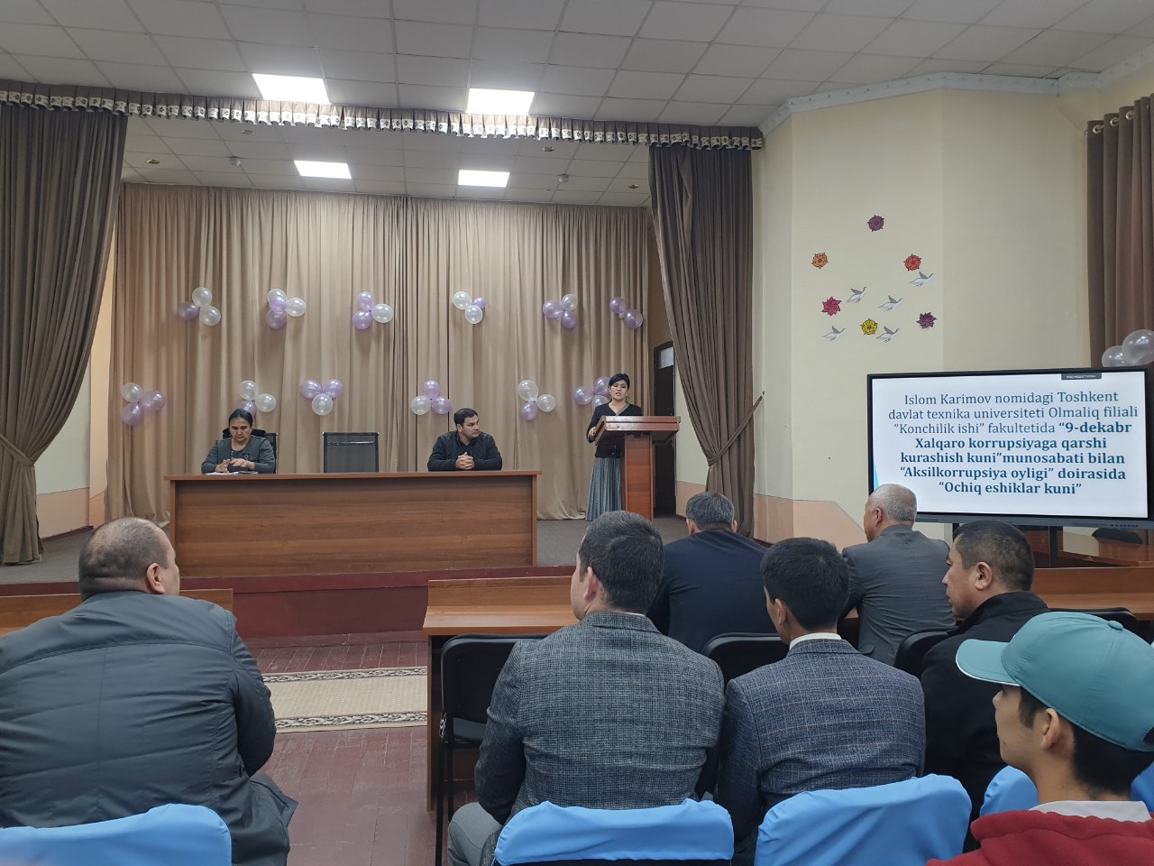 ✅As part of the “Anti-Corruption Month” dedicated to “December 9 – International Anti-Corruption Day”, an “Open Day” event was held at the Mining Faculty of the AB TSTU. The event was attended by the chief legal adviser of the department of justice of the city of Almalyk M. Ashurova, the head of the operational investigation service of the department of internal affairs of the Tashkent region, Major B. Usmanov, the prevention inspector Major A. Khaidarov and the leadership of the faculty, students.