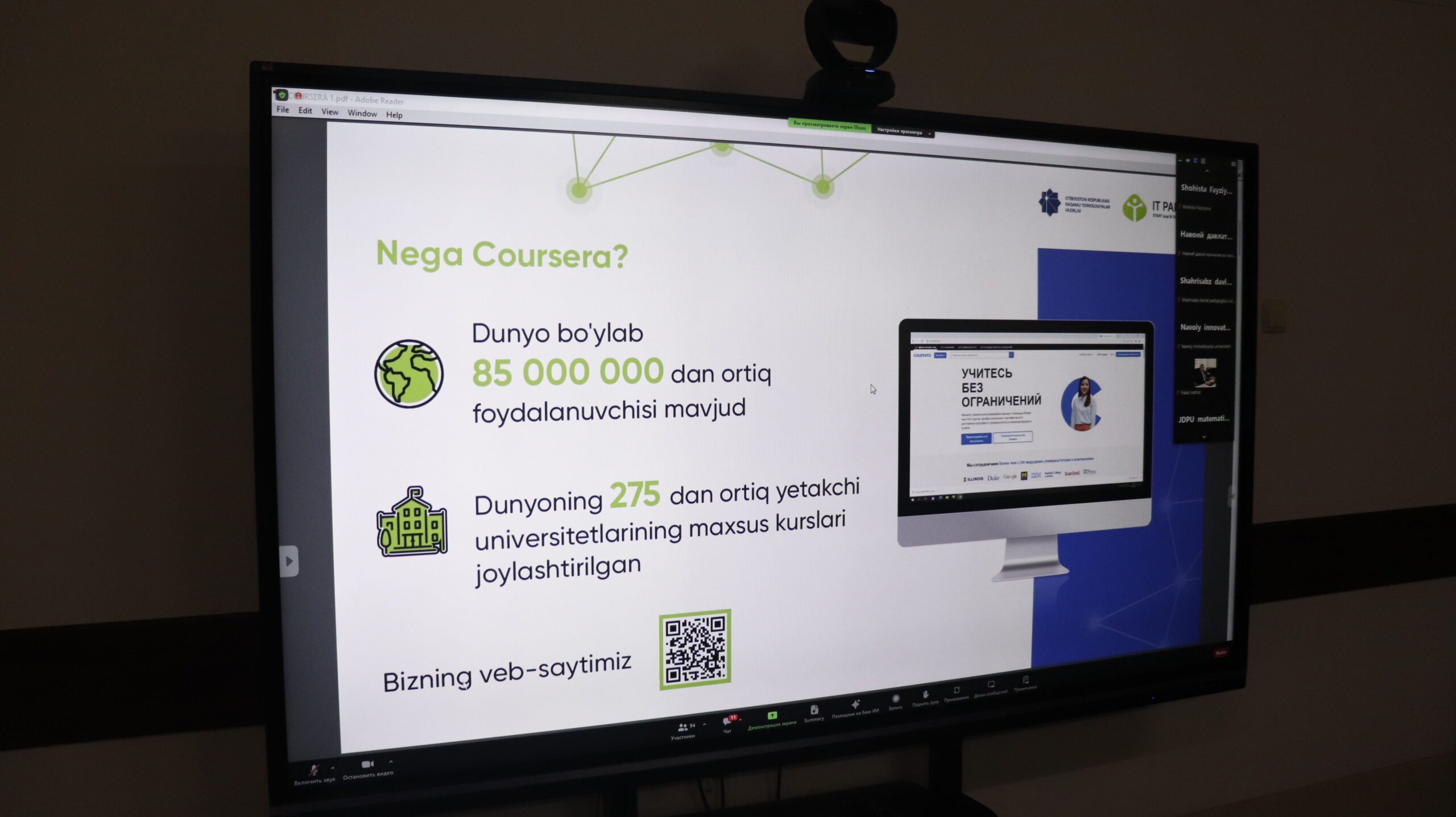 🔷A representative of the Ministry of Digital Technologies gave clarification on the use of online educational resources of the American company “Coursera” – the platform of Uzbekistancoders.uz of the “One Million Programmers” project at the faculties of the Almalyk branch of TSTU.