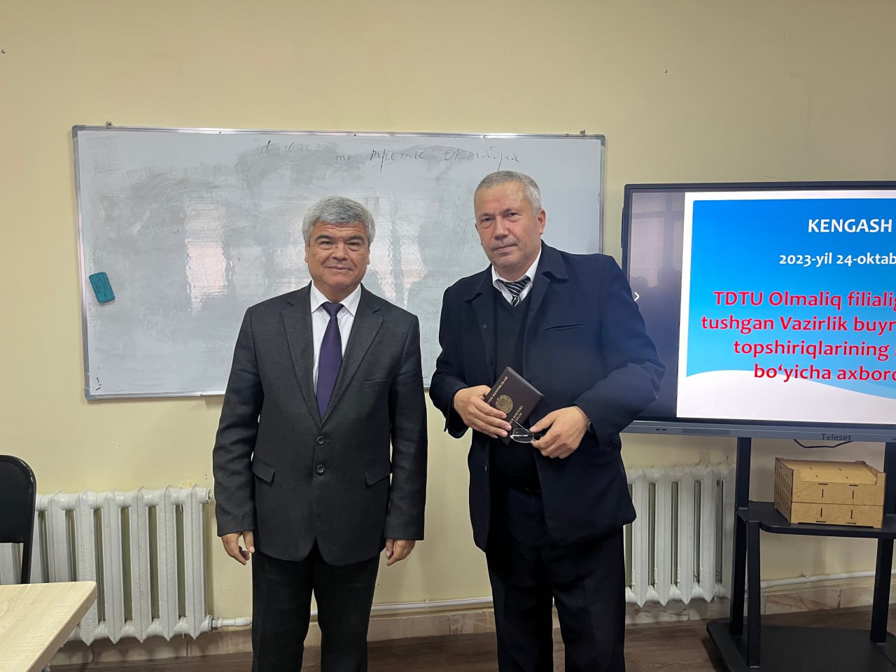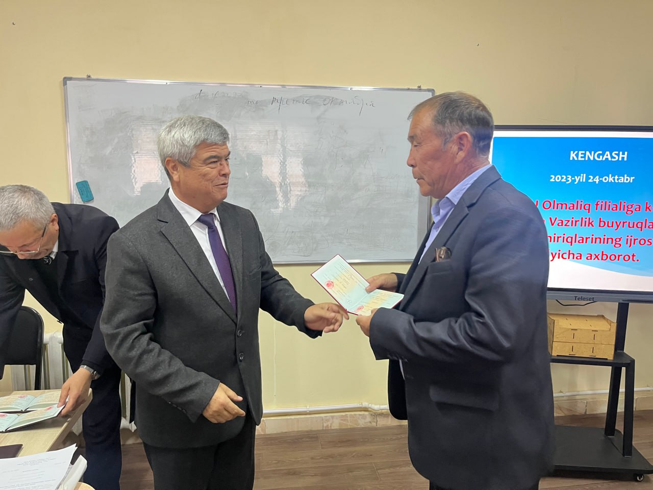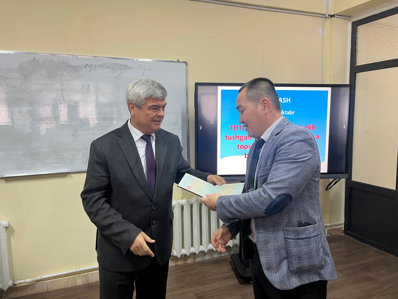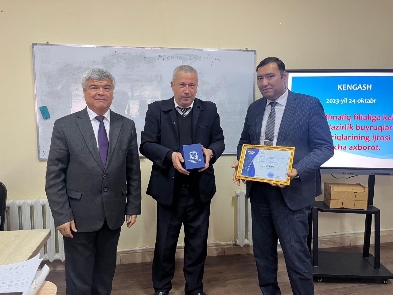 By the decision of the Higher Attestation Commission of the Republic of Uzbekistan, the secretary of the Branch Council A. Pirimkulov was awarded the academic degree of Doctor of Philology and a certificate, T. Norimbetov was awarded a certificate of awarding the academic title of associate professor, I. Sokhibov and B. Gaibnazarov were awarded the academic degrees of Doctor of Philosophy in Technical Sciences. Also, I. Sokhibov was awarded the “Leader of Innovative Idea” badge as part of the “Innovek” week of the Ministry of Higher Education, Science and Innovation.