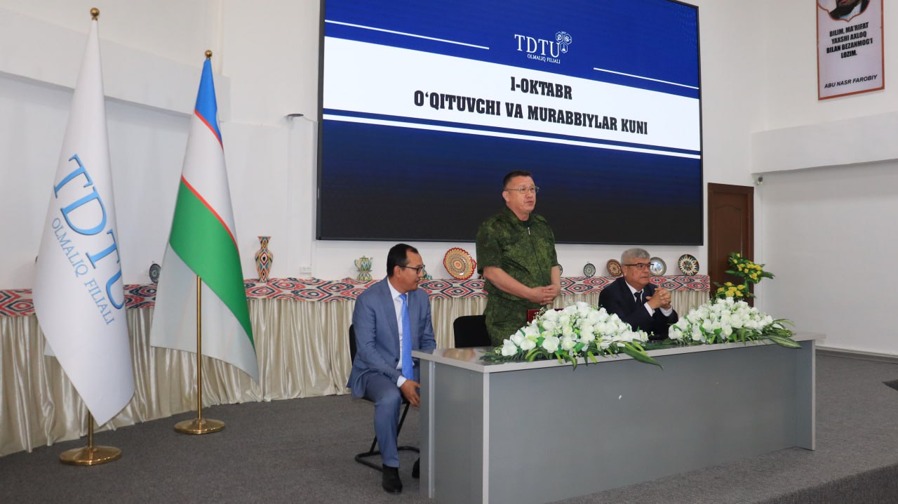 Bugun TDTU Olmaliq filialida 1-oktyabr – Oʻqituvchi va murabbiylar kuni bayrami munosabati bilan tantanali tadbir boʻlib oʻtdi. Tadbirda Toshkent viloyati Oliy ta’lim, fan va innovatsiyalar boshqarmasi boshligʻi N.Kulbekova hamda Respublika ma’naviyat-targʻibot markazi eksperti, veteran jangchi faxriylar kengashi raisi maslahatchisi M.Eshnazarov hamda filial jamoasi a’zolari ishtirok etishdi.