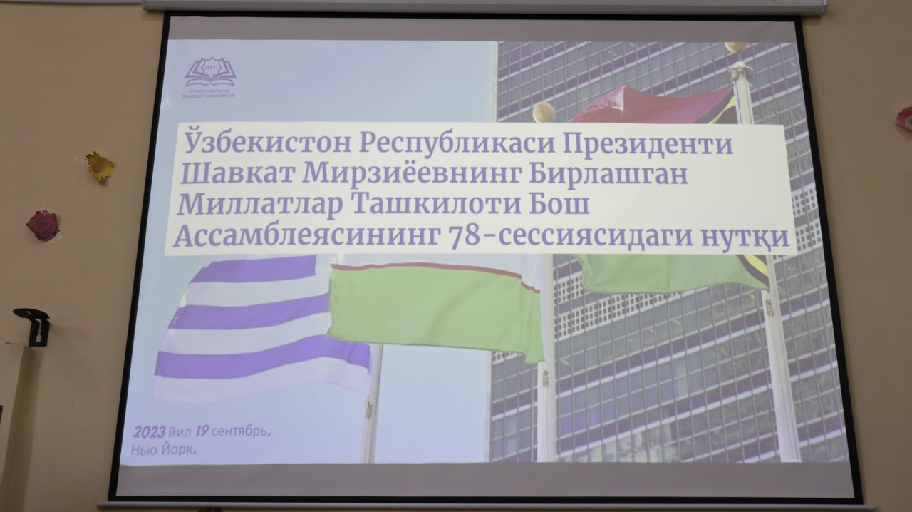 На мероприятии, организованном в Алмалыкском филиале ТГТУ было изучено содержание выступления главы государства на сессии Генеральной Ассамблеи ООН. На мероприятии директор филиала, д.т.н., профессор А.Самадов, доцент кафедры социальных и гуманитарных наук А.Рахматуллаев отметил, что доверие и воля наших соотечественников нашли отражение в инициативах, выдвинутых руководителем нашего государства.