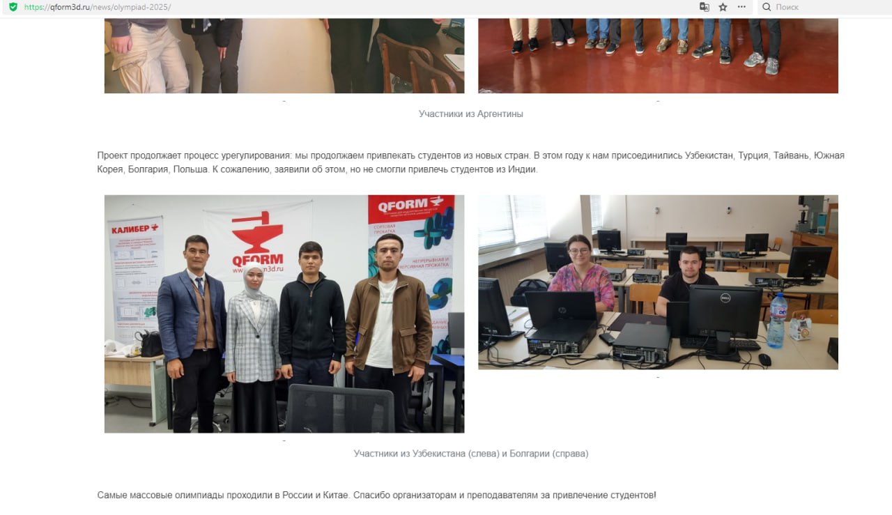 Отрадно, что на олимпиаде, прошедшей в апреле в Беларуси, студент Алмалыкского филиала ТГТУ Шерали Суюнов занял 1-е место в направлении «Горячая объемная штамповка» и был награжден дипломом QForm и памятными подарками. Большой вклад в успешное участие студентов в международной олимпиаде внес ассистент кафедры Ислам Камилов.