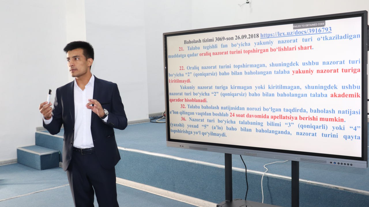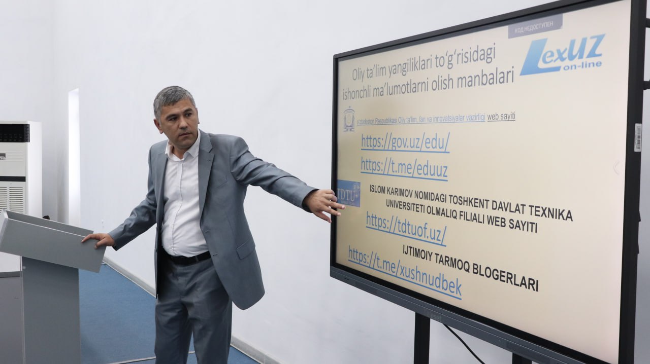 Студентам была предоставлена обширная информация о реформах, проводимых в системе высшего образования, и их результатах, о Министерстве высшего образования, науки и инноваций и руководстве ТДТУ, о деятельности филиала. Также им было подробно рассказано о цифровых образовательных платформах и кредитно-модульной системе обучения.