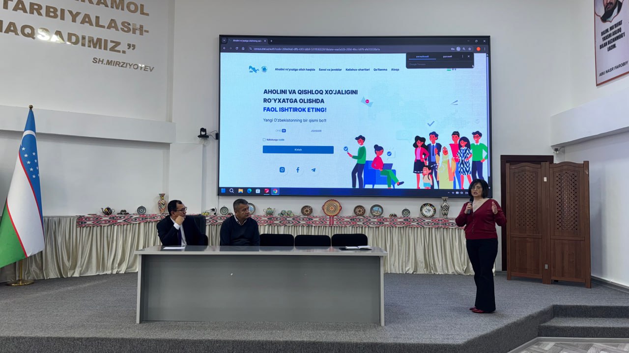 В целях качественного проведения запланированного на январь-февраль 2026 года процесс регистрации населения и сельскохозяйственных предприятий, специалисты на местах организуют семинары и тренинги. Планируется также привлечь к процессу студентов высших учебных заведений. Чтобы подготовить студентов к этому процессу, сегодня в Алмалыкском государственном техническом институте был организован семинар-тренинг. В семинаре приняли участие студенты Алмалыкского филиала MИСиС, университета Ипак йули и инноваций, а также университета Ангрен.