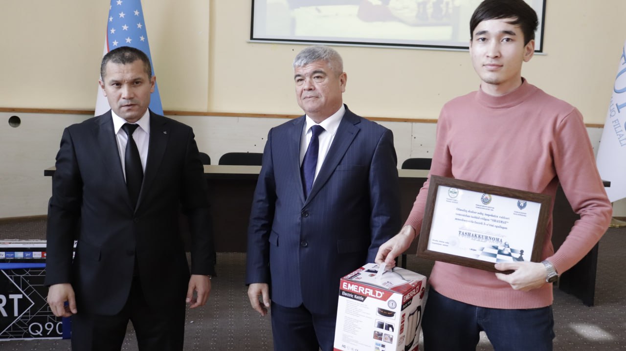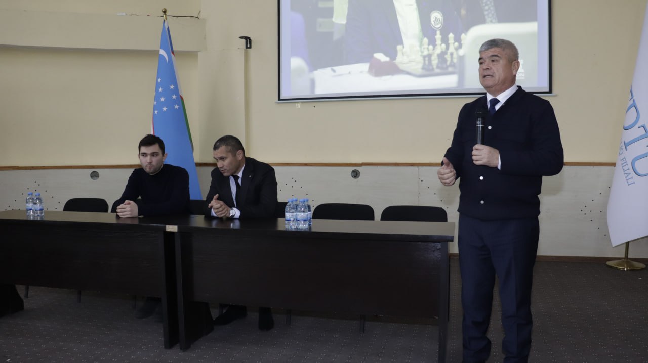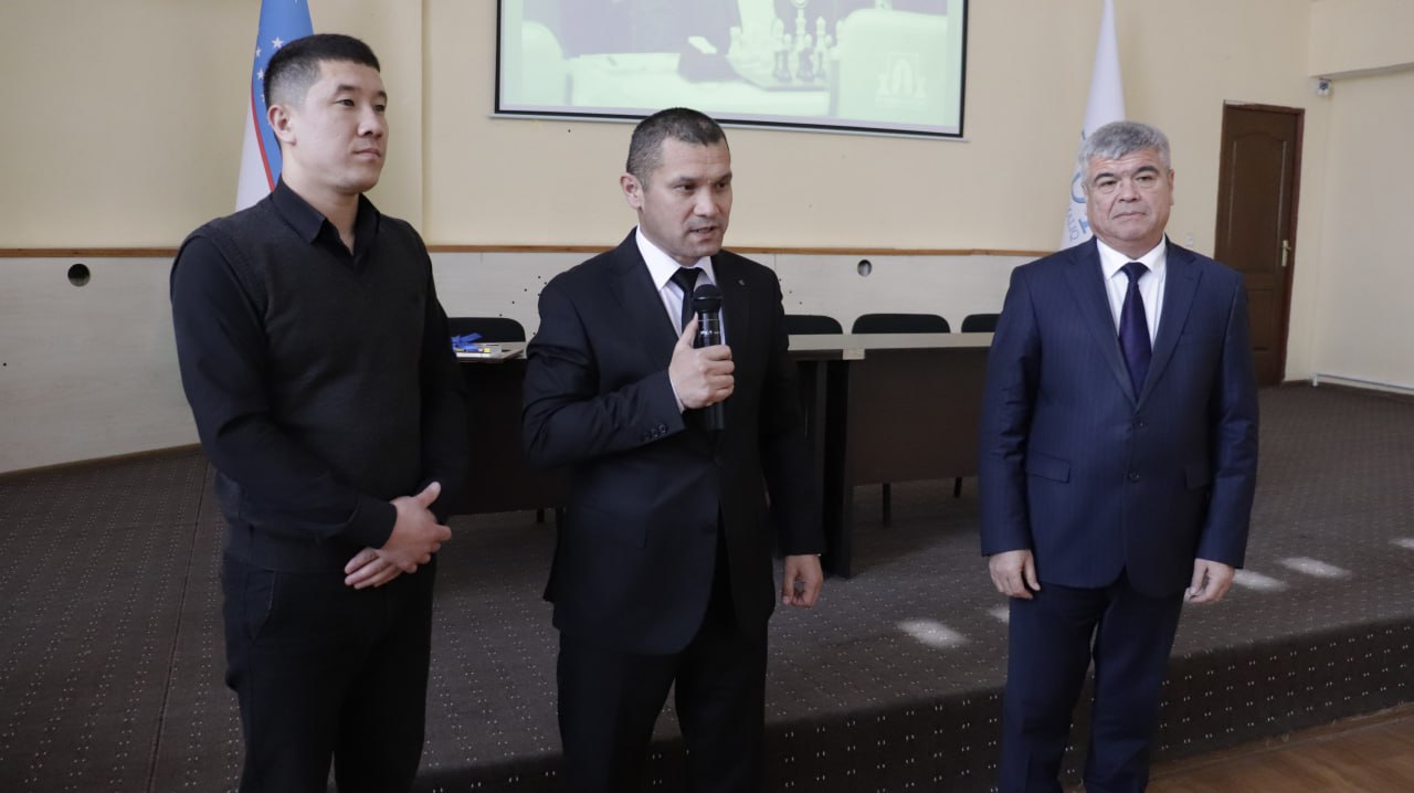 🔷Musobaqa avvalida filial direktori t.f.d. professor A.Samadov so’zga chiqib, barcha ishtirokchilarga omad tiladi. So’ng musobaqa mehmoni grossmeyster, shaxmat boʻyicha Oʻzbekiston chempionati gʻolibi, Hindistonning Chennay shahrida o’tkazilgan 44-shaxmat Olimpiadasi chempioni, Oʻzbekiston iftixori medali sohibi Nodirbek Yakubov shaxmat ixlosmandlariga o’z muvaffaqiyatlari haqida qisqacha so’zladi.
