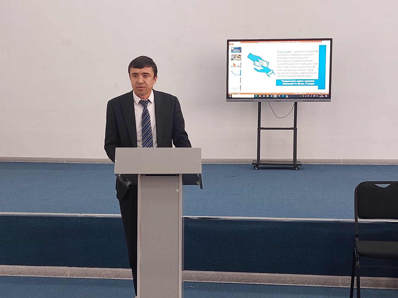 🔷Ohangaron shahar prokuratura tergovchisi III-darajali yurist E.Eshonqulov, Ohangaron shahar IIB huzuridagi tergov bo’limi boshlig’i podpolkovnik X.Ortiqov, TDTU Olmaliq filiali talabalar orasida ijtimoiy ma’naviy muhit barqarorligini ta’minlashda mas’ul bo’lgan direktor maslahatchisi M.Niyozov, filial profilaktika inspektori A.Xaydarov, filial korrupsiyaga qarshi kurashish va komplaens nazorati bo’limi boshlig’i A.Boynazarov ham mavzu yuzasidan so’zga chiqishdi.