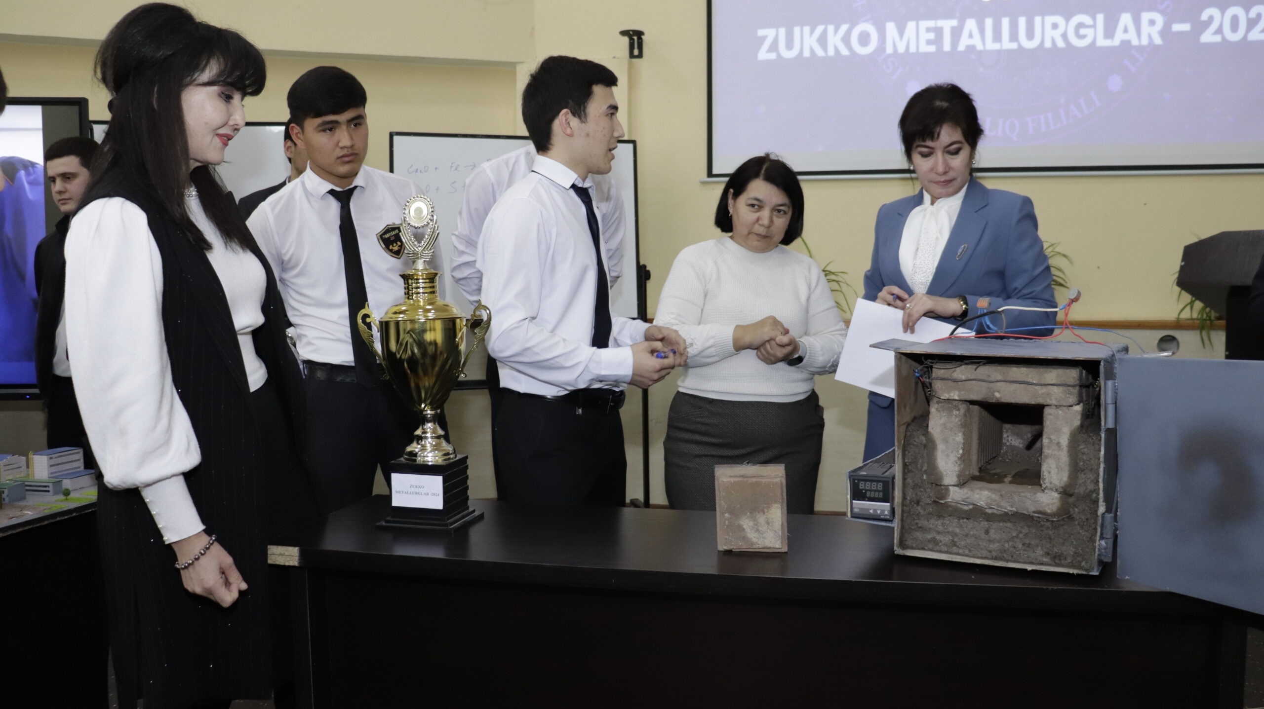 🔷“Metallurgik zavodlarning mexanik dastgohlari” fanidan o‘tkazilgan tanlovda 8 nafar ishtirokchidan iborat 4 ta guruh bellashdi. “Zukko metallurglar”, “Spetsialist”, “Injenerlar”, “Partisans” guruhlari metallurgik pechlarning 3D ko‘rinishi orqali texnologik jarayonlar haqida ma’lumot berishlari, metallurgik dastgoh va ularning ishlash texnologiyasi hamda umumiy metallurgiya yo‘nalishi, zamonaviy metallurgik dastgohlarning loyihalanishi yuzasidan bilimlarini ko‘rsata olishlari lozim edi. Tanlov jarayonida talabalar maxsus fan bo‘yicha egallagan bilimlarini to‘liq namoyon etishga harakat qildilar. Jamoaviy birdamlik va kuchli bilim bilan “Zukko metallurglar” jamoasi g‘oliblikni qo‘lga kiritdi.